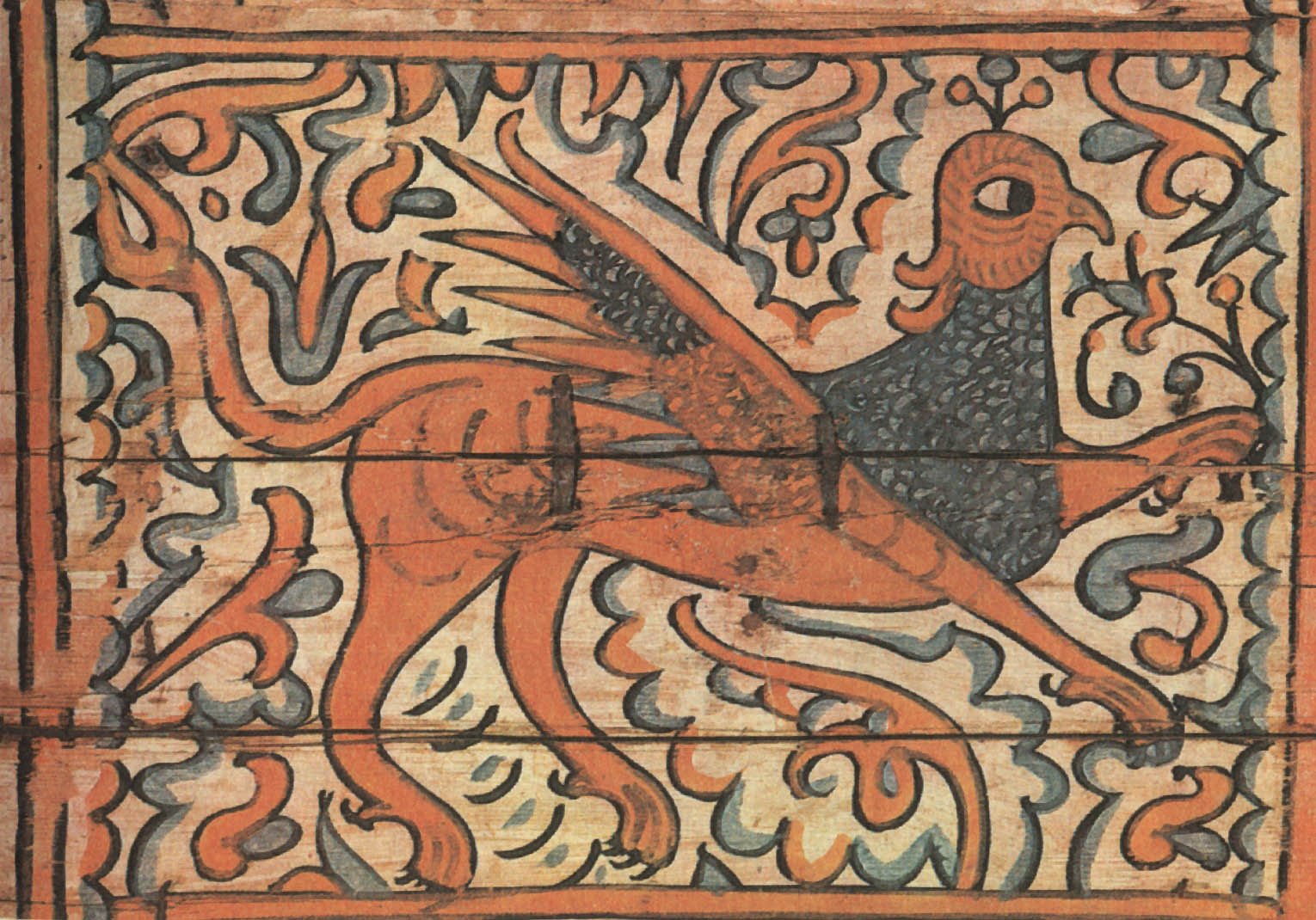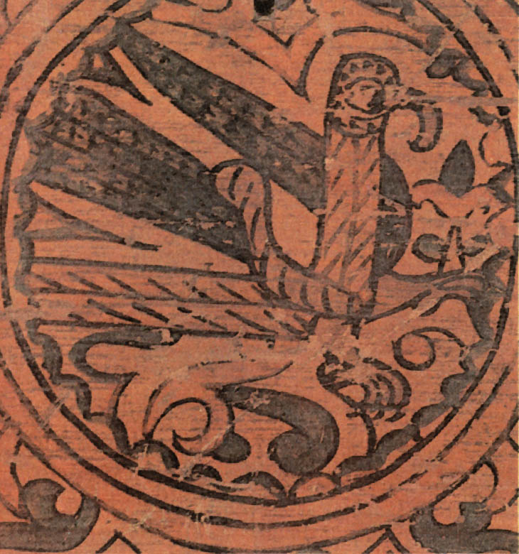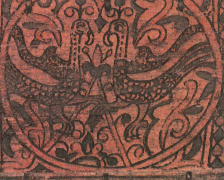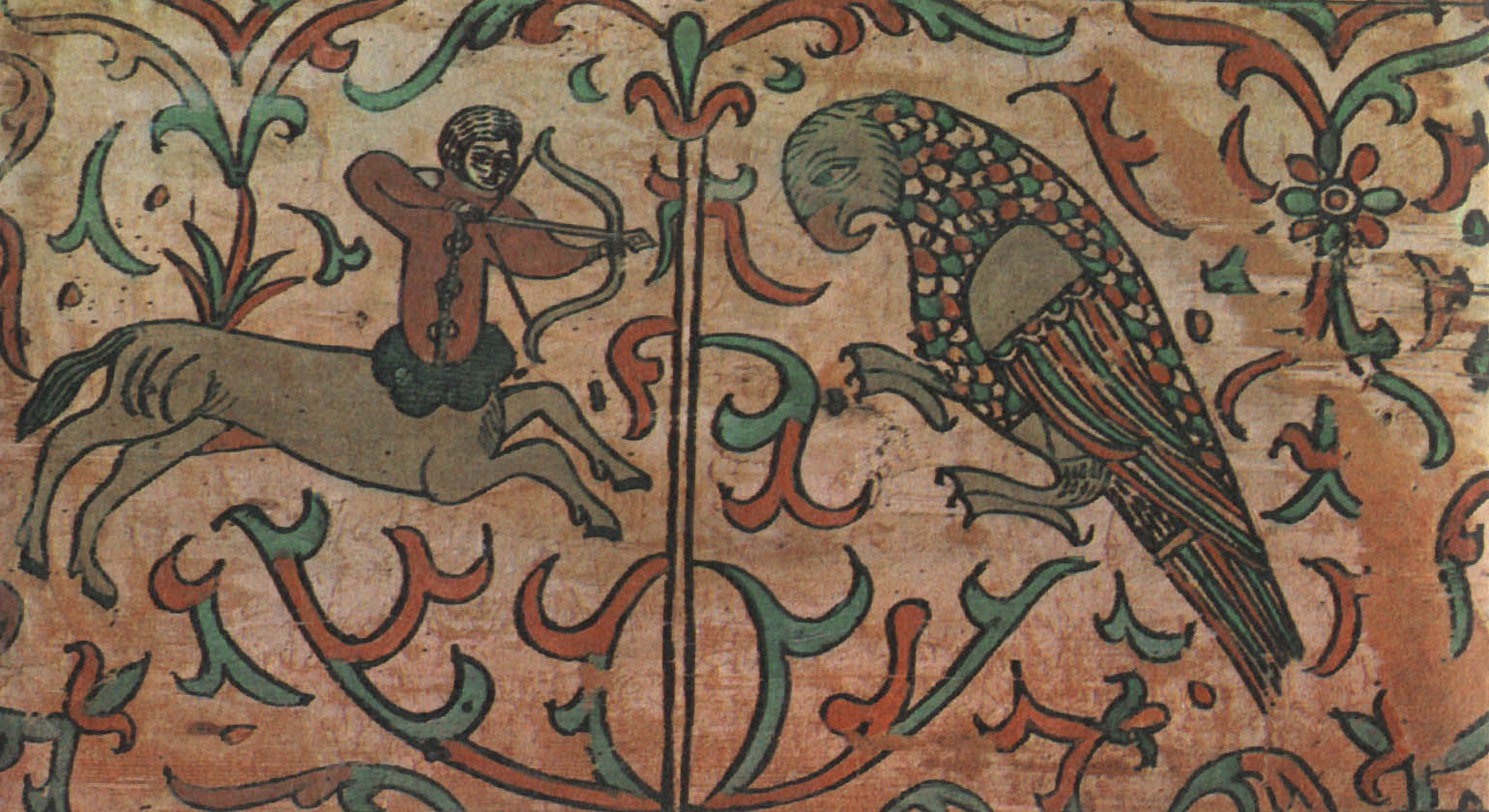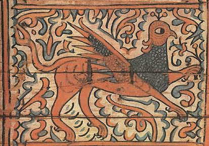 Кабы два зверя собиралися, Этот сюжет долго сохранялся в росписях — вплоть до начала XX века. Стратим-птица В средневековых легендах представления о птицах были не менее фантастичны, чем о животных. Им приписывали мифическую силу и власть. Считалось, например, что павлин своим криком может прогнать змей. Видимо, поэтому в росписях устюжан обязательно присутствуют птицы. Мы уже видели их в сценах сражений и рядом с легендарными героями. Спрятавшись в завитках растительного узора, повернув голову, птицы внимательно и настороженно смотрят на зрителя. В одном месте около птицы есть надпись «Орелъ». Видимо, и в царстве птиц, как и в зверином, художника привлекла самая сильная, гордая и неприступная птица. В средневековой русской литературе орлу приписывались мифические свойства. Согласно представлениям той эпохи, орел, чтобы проверить силу и жизнеспособность своих детенышей, обращал их к солнцу: тех, кто не мог смотреть на солнце прямо, не закрывая глаз, сбрасывал с высоты. Таинственная сила птицы передавалась даже его перьям. Поэтому к боевой стреле прикрепляли перо орла, чтобы она стала быстролетной и меткой. Такие стрелы ценились особенно. У былинного богатыря Дюка Степановича, например, из трехсот стрел таких было всего три, и им «цены не было». «Потому тем стрелам цены не было, [что] колоты оне были из трость дерева, клеены они клеем осетра рыбы, перены они перицем [т. е. пером] сиза орла, а сиза орла, Орла Орловича...» Орел на росписях устюжских художников как живой: с толстыми когтистыми лапами, крупным телом, большим хищно загнутым клювом. По размеру орел больше всех остальных персонажей сценок, будь то заяц, олень или человек. В сцене битвы с Полканом орел превосходит размером даже самого богатыря. Следовательно, автору росписи эта птица казалась такой значительной, что менее крупным планом показать ее было нельзя. Часто орел изображался с добычей в клюве или терзающим свою жертву. Однако наряду с орлом народные сказания воспевали и другую птицу— владычицу океана. В одном из произведений XVI—XVII веков, в «Голубиной книге», эта птица характеризуется так: