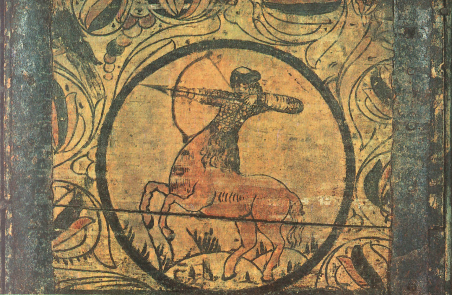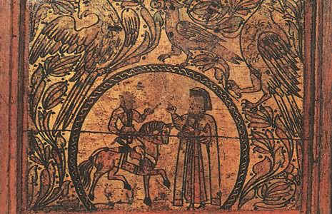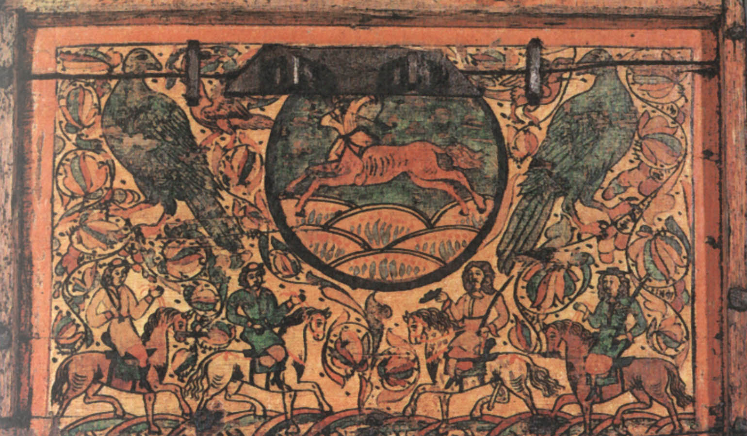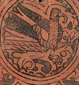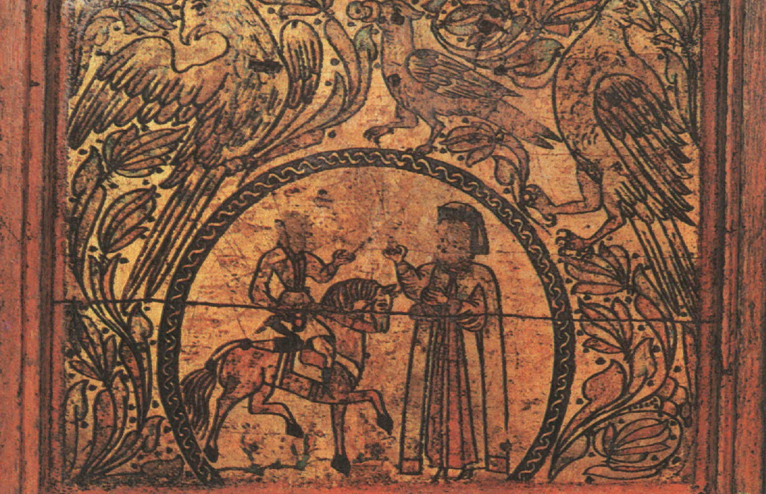 Кабы два зверя собиралися, Этот сюжет долго сохранялся в росписях — вплоть до начала XX века. Стратим-птица В средневековых легендах представления о птицах были не менее фантастичны, чем о животных. Им приписывали мифическую силу и власть. Считалось, например, что павлин своим криком может прогнать змей. Видимо, поэтому в росписях устюжан обязательно присутствуют птицы. Мы уже видели их в сценах сражений и рядом с легендарными героями. Спрятавшись в завитках растительного узора, повернув голову, птицы внимательно и настороженно смотрят на зрителя. В одном месте около птицы есть надпись «Орелъ». Видимо, и в царстве птиц, как и в зверином, художника привлекла самая сильная, гордая и неприступная птица. В средневековой русской литературе орлу приписывались мифические свойства. Согласно представлениям той эпохи, орел, чтобы проверить силу и жизнеспособность своих детенышей, обращал их к солнцу: тех, кто не мог смотреть на солнце прямо, не закрывая глаз, сбрасывал с высоты. Таинственная сила птицы передавалась даже его перьям. Поэтому к боевой стреле прикрепляли перо орла, чтобы она стала быстролетной и меткой. Такие стрелы ценились особенно. У былинного богатыря Дюка Степановича, например, из трехсот стрел таких было всего три, и им «цены не было». «Потому тем стрелам цены не было, [что] колоты оне были из трость дерева, клеены они клеем осетра рыбы, перены они перицем [т. е. пером] сиза орла, а сиза орла, Орла Орловича...» Орел на росписях устюжских художников как живой: с толстыми когтистыми лапами, крупным телом, большим хищно загнутым клювом. По размеру орел больше всех остальных персонажей сценок, будь то заяц, олень или человек. В сцене битвы с Полканом орел превосходит размером даже самого богатыря. Следовательно, автору росписи эта птица казалась такой значительной, что менее крупным планом показать ее было нельзя. Часто орел изображался с добычей в клюве или терзающим свою жертву. Однако наряду с орлом народные сказания воспевали и другую птицу— владычицу океана. В одном из произведений XVI—XVII веков, в «Голубиной книге», эта птица характеризуется так: