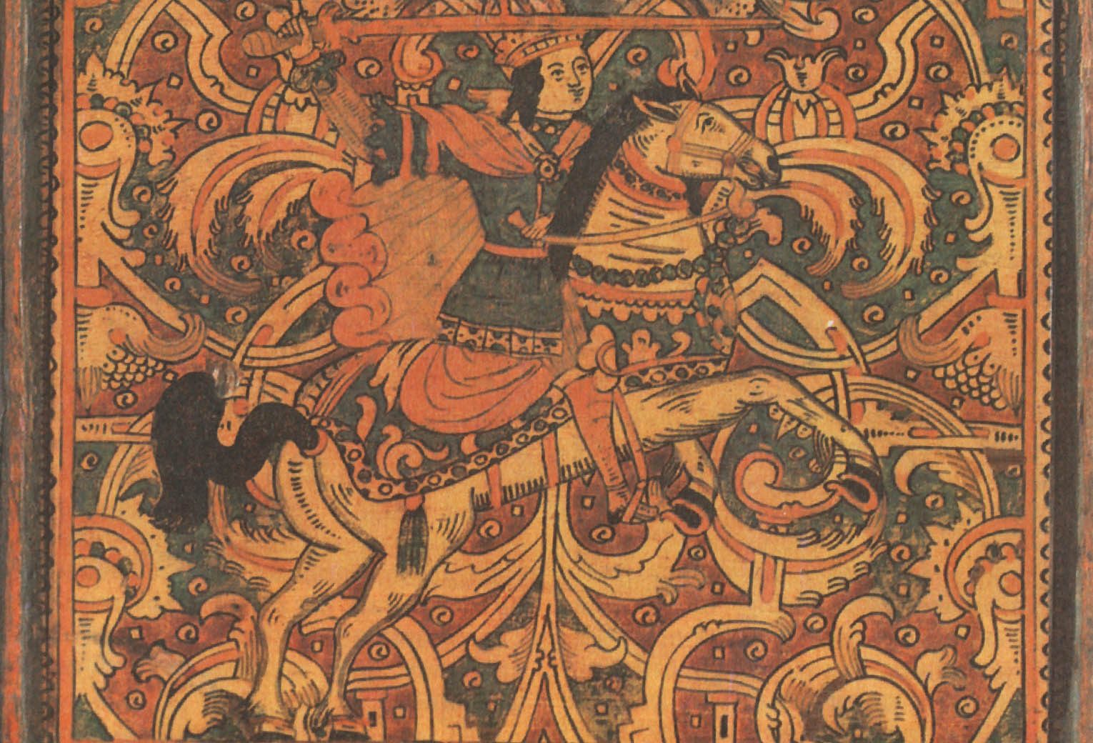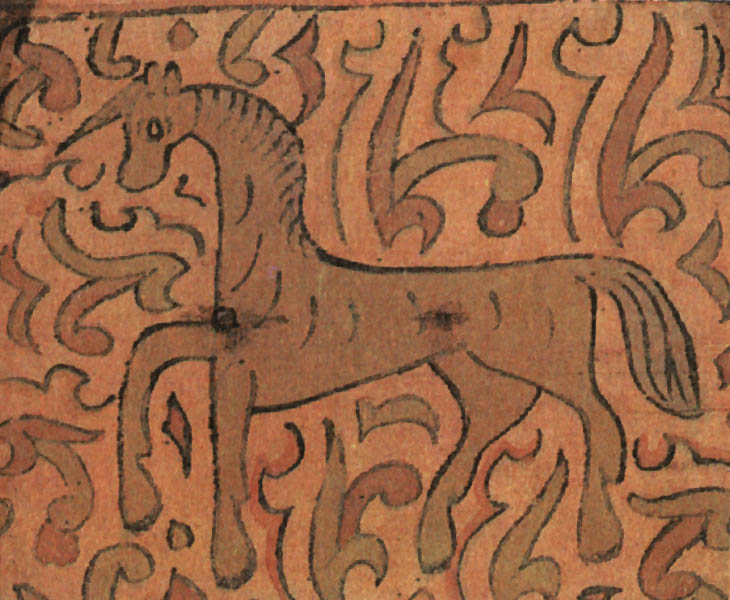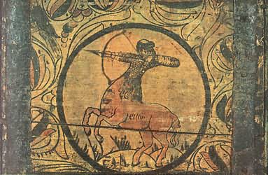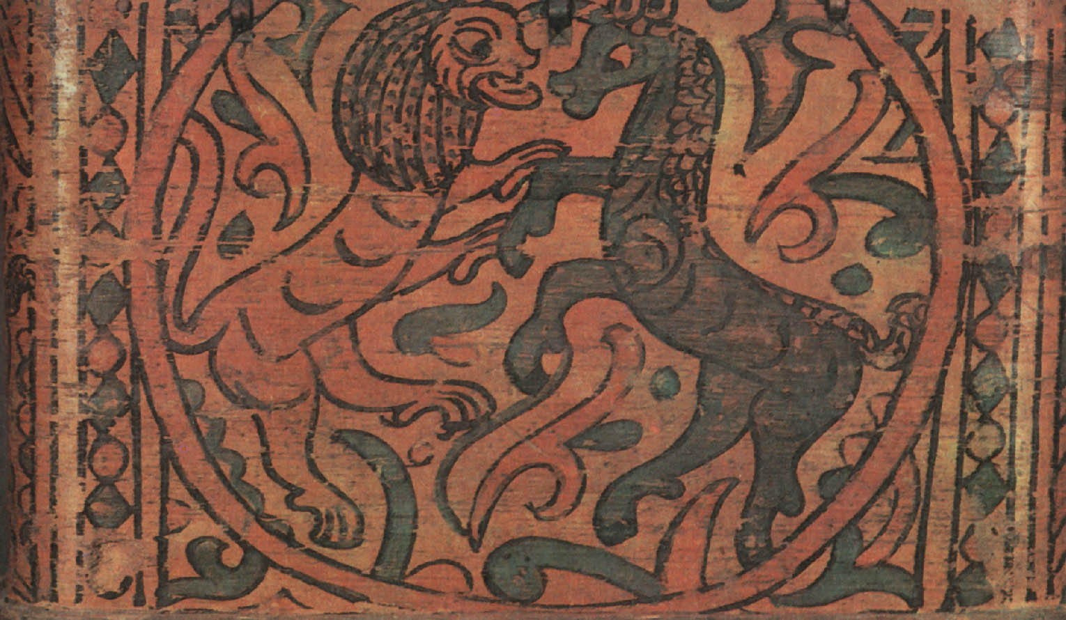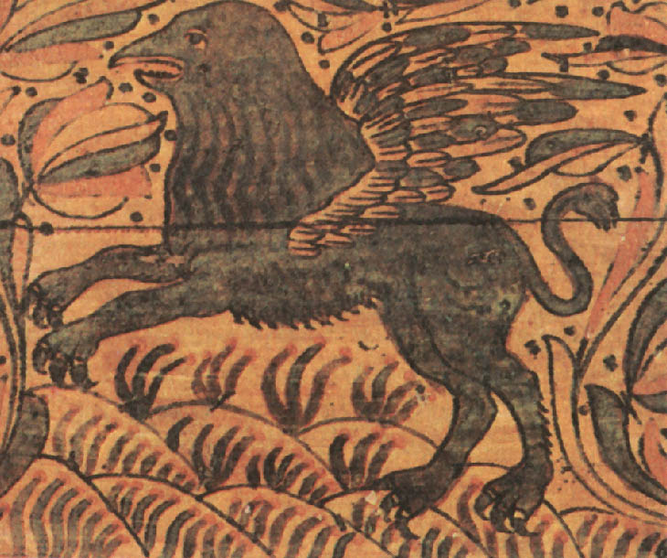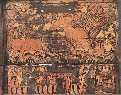 У нас индрик зверь — всем зверям отец, Нарисованный на крышке на фоне трав и цветов, единорог весело скачет, напоминая жеребеночка, выпущенного пастись на зеленую травку. ![]() Мифический зверь единорог. Роспись коробьи. Район Великого Устюга. XVII век. Это сходство еще увеличивает его глуповато-удивленная мордочка, приподнятые для прыжка передние ноги, мягкая шоколадная окраска животного. Чтобы показать зрителю, что действие происходит «на лоне природы», художник разбросал по фону растения. Желтовато-красная гамма росписи делает ее мягкой и изысканной по колориту. В росписях на коробьях единорог изображается то один, то вместе со львом. Звери показаны в позе борцов: поднявшись на задние лапы, они обхватили друг друга передними, а рог единорога, изогнутый, как бы вонзился в голову противника. Несмотря на «ожесточенность» сражения, оба зверя выглядят весьма добродушно. Лев, как собачонка, высунул язык, а единорог будто разглядывает его скошенным круглым глазом. У обоих торчат треугольничками уши и изогнуты хвосты. Кажется, что звери не борются, а резвятся и играют. Расцветка подчеркивает их забавность и сказочность: у зеленого единорога ушки и челка окрашены желтым, отсвечивают золотом большой круглый глаз и крючком загнутый хвостик. У желтого льва — пышная зеленая грива, а длинным красным языком он как будто собирается лизнуть «врага». Несмотря на сходство в позах, очертаниях туловища и движениях, у каждого зверя четко выражена «индивидуальность»: показана параллельными полосками грива льва, в промежутках она украшена точками, а у единорога шея — чешуйками. Чуть удлинив морду единорога, придав его туловищу большую гибкость и подрисовав копыта, художник подчеркнул его самые отличительные черты. ![]() Сражение льва с единорогом. Роспись коробьи. Район Великого Устюга. XVII век. Можно предположить, что позы борющихся друг с другом зверей были навеяны изображением на гербе: в XVI веке лев и единорог, стоящие друг против друга на задних лапах, стали фирменным знаком Московского печатного двора. Этот знак часто изображался на переплетах книг той эпохи. Однако у народного художника эти звери потеряли характерную для герба торжественную неподвижность. Борьба льва и единорога могла рассматриваться и символически, как борьба светлого и темного, дня и ночи, правды и кривды. По-видимому, это об их нескончаемом единоборстве говорится в народной песне: