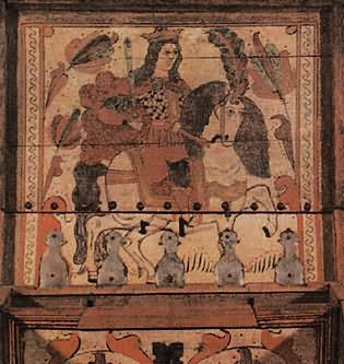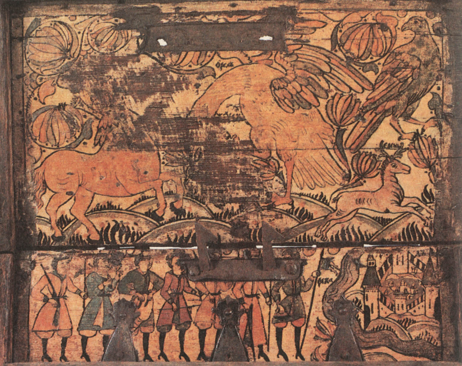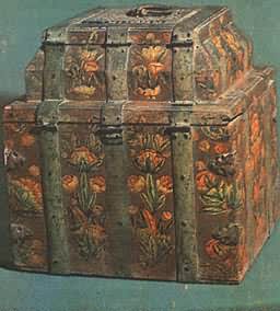 Как и тот ли терем изукрашенный Сундук-теремок отчасти повторяет форму древнерусской постройки. Как и у зданий той эпохи, в основе его лежит куб, завершающийся четырехскатной крышею; крыша является крышкой сундука. На ней делался небольшой прямоугольный плоский уступ, который на первый взгляд можно принять за архитектурное украшение. На самом деле здесь было устроено еще одно, потайное, отделение сундучка —для особо ценных вещей. По аналогии двухэтажными зданиями такие сундучки назывались двужирными. В одном из документов — перечислении расходов за 1681 год —записано, например: «куплена шкатюля о два жира, колмогорсково дела, дано 2 р. 20 алтын, окована железом луженым о пяти вертлюгах». «Колмогорсково дела» — значит, сделанная в Холмогорах. Сам сундук делался из дуба — самого крепкого дерева, а снаружи он еще оковывался железом, снабжался большим замком, крышка навешивалась на железных петлях — вертлюгах. Чем больше было этих петель, тем надежнее сундук, тем дороже он ценился. Из приведенного документа видно, что теремок стоил почти в восемь раз дороже коробьи, тоже окованной и с замком. А коробья неокованная, подобная тем, о которых мы говорили выше, стоила еще дешевле. Поэтому простую коробью мог приобрести даже крестьянин, а окованные сундуки принадлежали состоятельным горожанам, боярам, находились в хоромах царя и царицы. О покупке таких сундуков приведено много документов в книге И. Е. Забелина «Домашний быт русских цариц в XVI—XVII столетиях». Вот, например, один из них: «...Июля 22 дня за сундук дубовый с оковы железными [заплачено] 3 рубля 4 алтына. Взят в царицыну мастерскую на государево платье». Кстати, холмогорский теремок «о пяти вертлюгах» предназначался в подарок московскому митрополиту. ![]() Сундук-теремок, украшенный железными полосами и росписью. Великий Устюг. Начало XVIII века. Как мы уже сказали, сундук для большей прочности оковывали железными полосами. Однако искусные северные кузнецы превращали их в нарядное украшение. Железные полосы просекались узором наподобие кружева, а чтобы этот узор ярче выделялся, под железные полосы подкладывалась красная или зеленая бумага и слюда. Можно представить себе, как красив был такой теремок! Искусством украшать сундуки узорным железом кузнецы города Великого Устюга (тоже на Северной Двине) славились, пожалуй, не меньше, чем холмогорцы. В документах иногда указывалось место, где был сделан сундук: «колмогорского дела», «устюжского дела». Поэтому не случайно в описи имущества тотемского и устюжского епископа, умершего в 1735 году, значились «шкатуля просечная устюжского дела» и такая же скрыночка (тоже сундучок) «колмогорского дела». Естественно, что для украшения таких ценных изделий приглашались художники опытные, или, как мы сказали бы сейчас, художники-профессионалы, для которых занятие живописью было постоянным ремеслом. Откуда это известно? Мы уже отметили разницу в мастерстве, с каким исполнены росписи коробьи и сундучка. Кроме того, до нас дошло очень интересное и редкое свидетельство. В нем указано, кем и в связи с каким обстоятельством был расписан один из сундучков почти триста лет тому назад. Это событие было записано в книге расходов архиерейского дома, находившегося в Великом Устюге. Дом архиерея был одним из самых богатых в городе. Запись представляет большой и