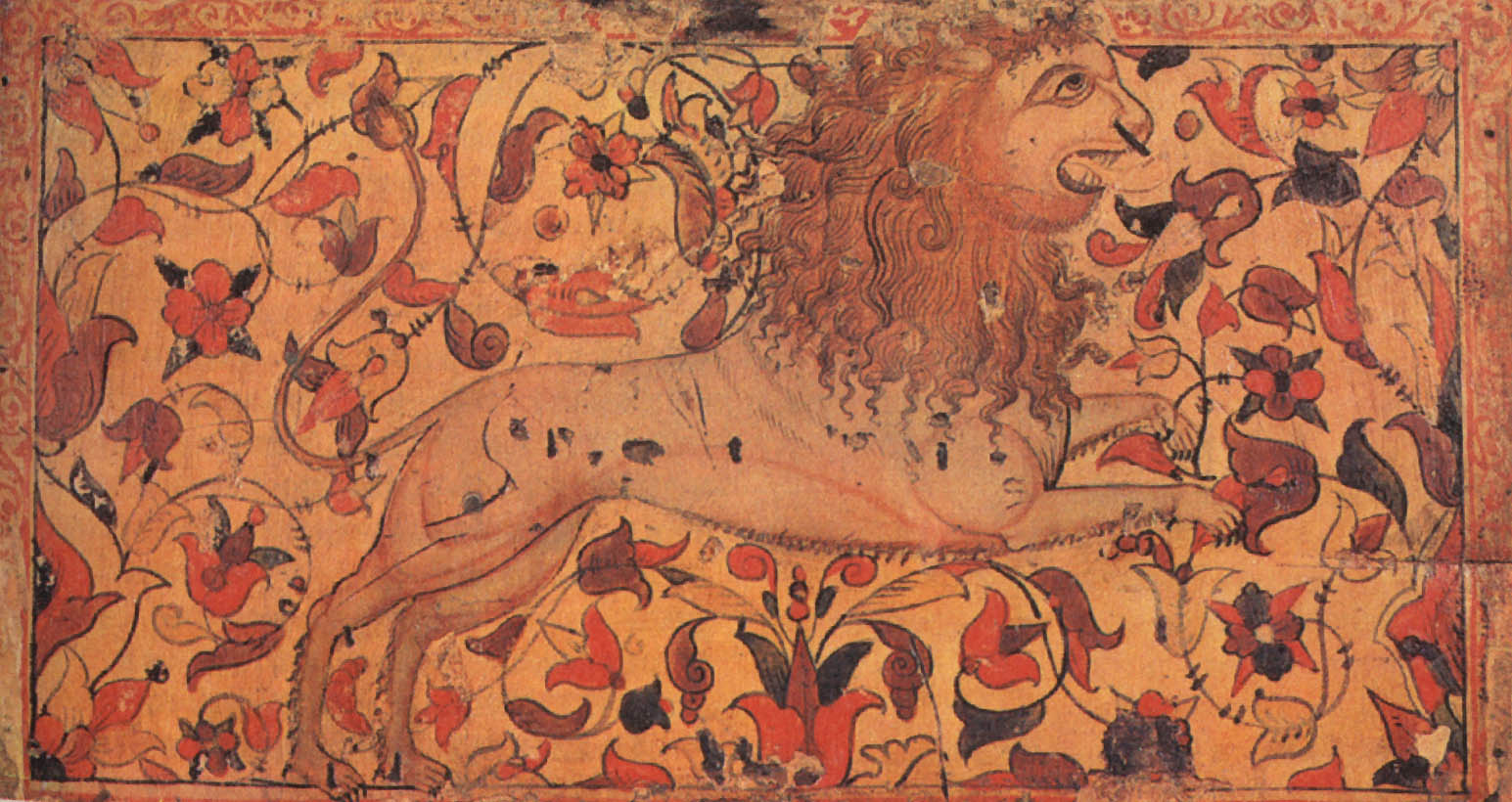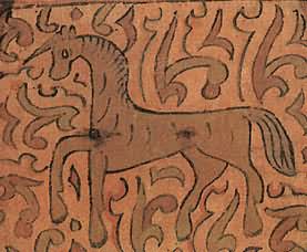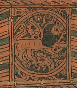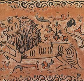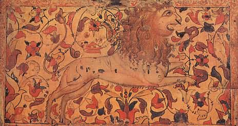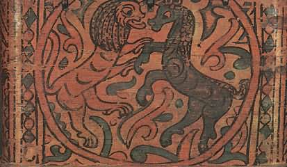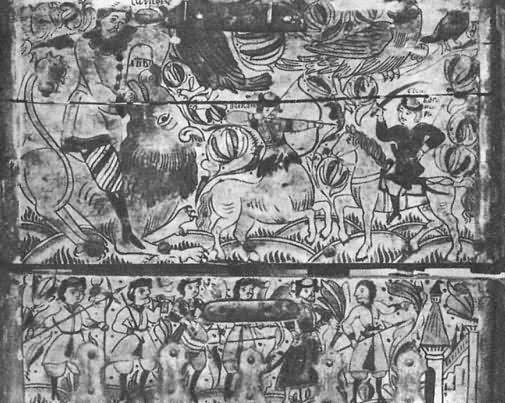 Снаружи этот сундучок совсем непривлекательный: дерево от времени сильно потемнело, железные полосы частично обломались, исчезли подложенные когда-то под прорезной узор цветная бумага и слюда. Но как только мы поднимем его крышку, впечатление от ветхости предмета исчезает: яркий узор из трав и цветов и помещенный на их фоне лев кажутся только что написанными. Дело в том, что роспись сундучка была реставрирована, т. е. промыты потемневшие от времени краски, восстановлен стершийся рисунок. Работу эту доверяют только специалистам. Лев стоит на задних лапах, а передние подняты в воздух: он приготовился к прыжку, собираясь, по-видимому, напасть на невидимую нам жертву. Поэтому так широко раскрыта его пасть с двумя рядами острых зубов. Пышная грива покрывает не только шею животного, но и его голову. Миндалевидные глаза льва напоминают человеческие. Почему облик зверя получился таким фантастическим? И каким образом этот обитатель тропиков попал на далекий Север? История появления его на Руси довольно сложная и уходит в глубокую древность. В странах Востока, т. е. у себя на родине, лев считался когда-то божеством; видимо, это почитание зверя было вызвано его свирепостью и силой. Как эмблема (знак) этой силы льва всегда изображали рядом с правителями государств. Из стран древнего Востока еще в первые века нашей эры лев перекочевал к нам на Русь. Однако в представлениях наших предков характер зверя стал иным: он как бы утратил черты свирепого и злого хищника, остались только сила, мужество и благородство, т. е. те черты, которые русский человек испокон веков ценил превыше всего, воспевая их в песнях, былинах и сказках. ![]() Царя зверей — льва художник изобразил похожим на человека. Роспись сундука. Северная Двина. XVII век. Образ льва стал на Руси весьма популярным: его изображение можно увидеть в скульптуре, на изразцах, в рисунках тканей, в изделиях из серебра, простого металла, дерева и многих других. Как подсчитал известный исследователь древнерусского искусства Г. К. Вагнер, только на рельефах владимиро-суздальских строений XII XIII веков изображение льва встречается 82 раза! Этого зверя можно часто увидеть даже в иллюстрациях церковных книг: он фигурирует там как «борец со злом» или как «каратель за грехи человеческие». Так, например, в одной из них лев очень похож на зверя, нарисованного художником на рассматриваемом нами сундуке: у него такой же очеловеченный облик, так же широко раскрыта оскаленная пасть и точно так же встал он на задние лапы, подняв передние. Только в этом случае рядом стоит жертва, которую лев, выйдя из бездны, должен покарать по «божьему повелению». Видимо, сходство льва, написанного на сундуке, с библейским «карателем» получилось у художника не случайно. Мы знаем, что художник занимался еще иконописью, он мог и церковные книги иллюстрировать, поэтому именно такой облик животного был для него наиболее привычен. Однако в росписи лев похож на библейского лишь внешне. Значение же его совсем иное. Помещенный на фоне расцветшего яркими узорами ковра, зверь прыгает и резвится, как на цветущем лугу. Его очеловеченная морда лишена суровости исполнителя «высшего приговора», а оскаленная пасть чем-то напоминает улыбку. ![]() В росписи коробьи лев выглядит весьма добродушным. Район Великого Устюга. XVII век В уверенных линиях видна рука 