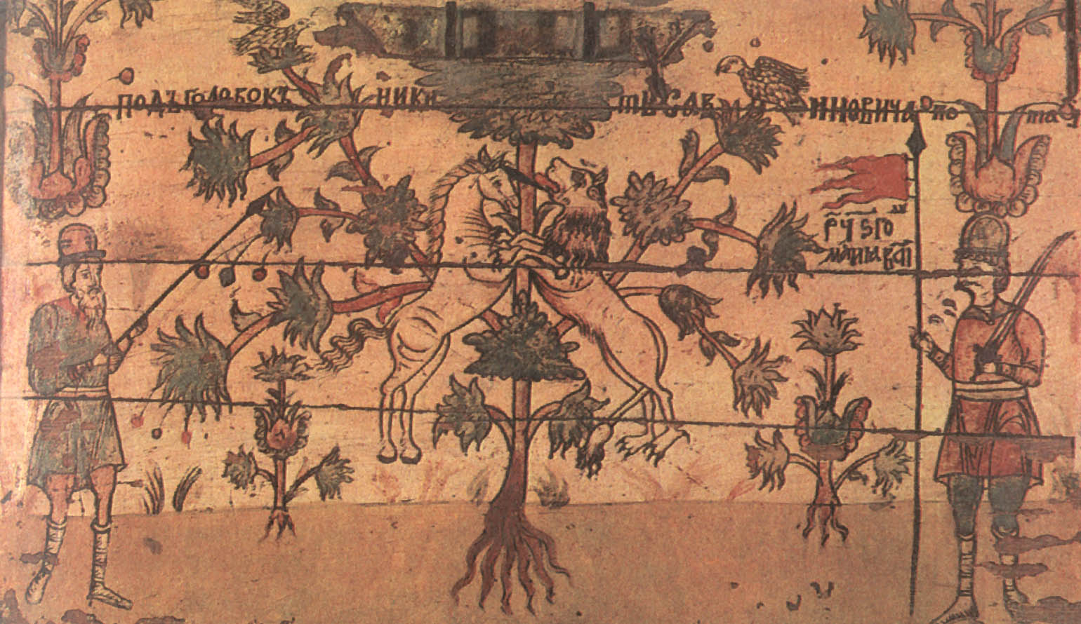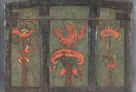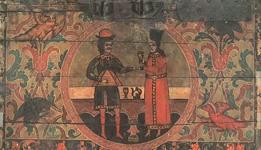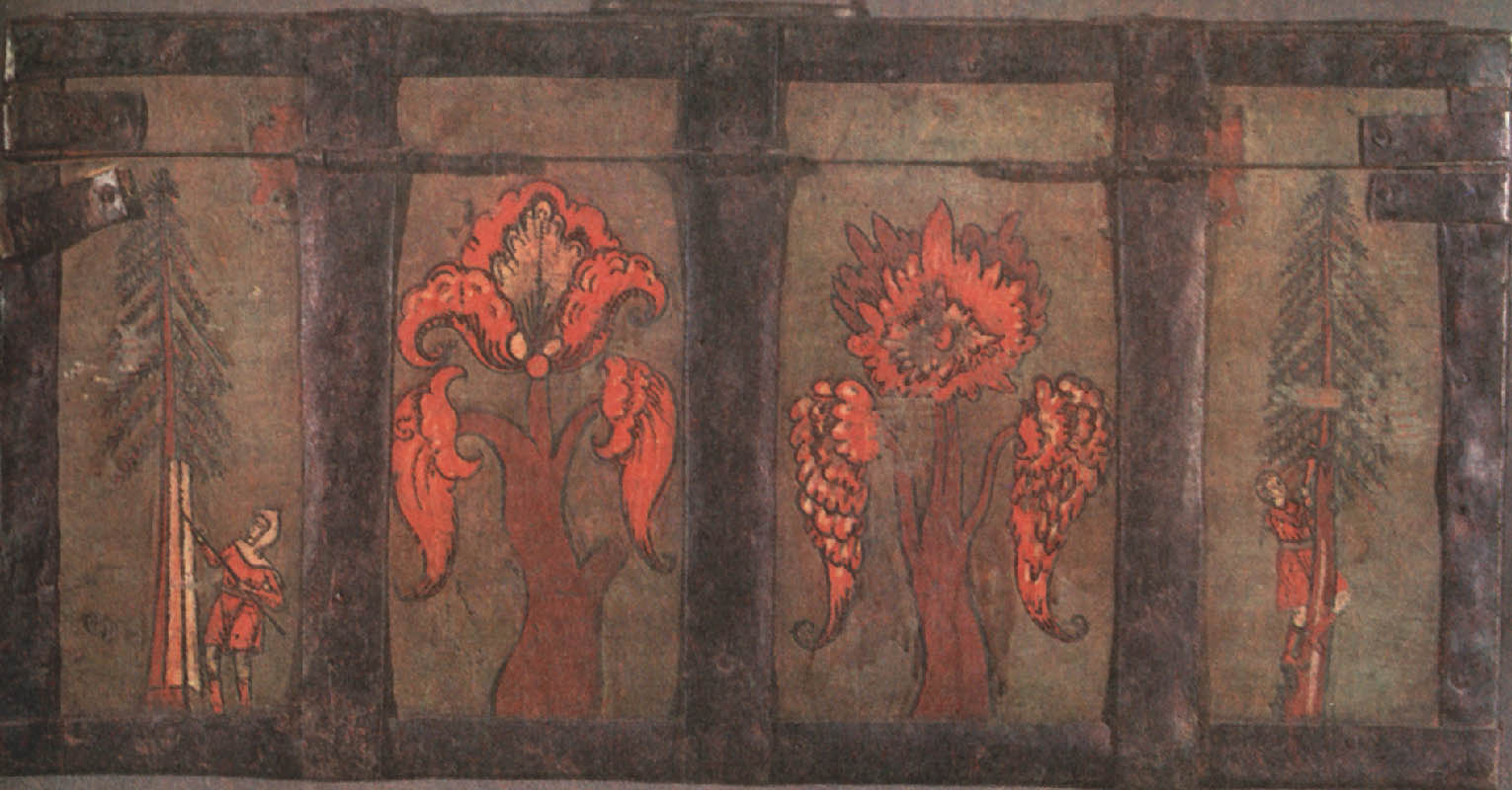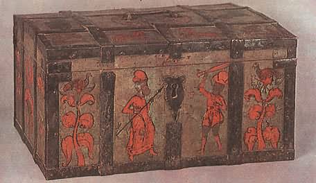 На землях Марфы БорецкойНовгородская живопись навсегда останется одной из самых блестящих страниц не только древнерусского, но и всего русского искусства. «Подъголовокъ Никиты Савиновича Потапова» Перед нами опять сундучок-подголовок— «призголовашекъ травчатой». Наружные стенки его, как тонким кружевом, окованы сплошь просечным железом; переплетенный сложными петлями узор отдаленно напоминает растения. Внутренняя сторона крышки тоже расписана. В центре художник поместил фантастическое дерево. О его ствол опираются поднявшиеся на задние лапы и соединившиеся, как в дружеском объятии, лев и единорог. По обе стороны дерева — старик и юноша, оба в длинных русских рубахах, округлых, опушенных мехом шапках и мягких сафьяновых сапожках. Оба вооружены пиками, только у юноши еще сабля и на конце пики флажок-прапор. Симметрично расставив фигуры зверей, юноши и старца, художник сделал композицию картины уравновешенной и спокойной. Сочетание сине-зеленого Цвета (празелени) с темно-красным (баканом) на желтоватом фоне увеличивает впечатление гармонии и покоя. Задумчиво и важно лицо старца, неторопливо движение его руки, поднявшей пику; словно задумавшись, оперся на оружие юноша; даже бросившиеся друг к другу звери как бы застыли в броске. И лишь птицы на вершине дерева несколько нарушают покой: у них приподняты крылья, полуоткрыт хищно загнутый клюв.