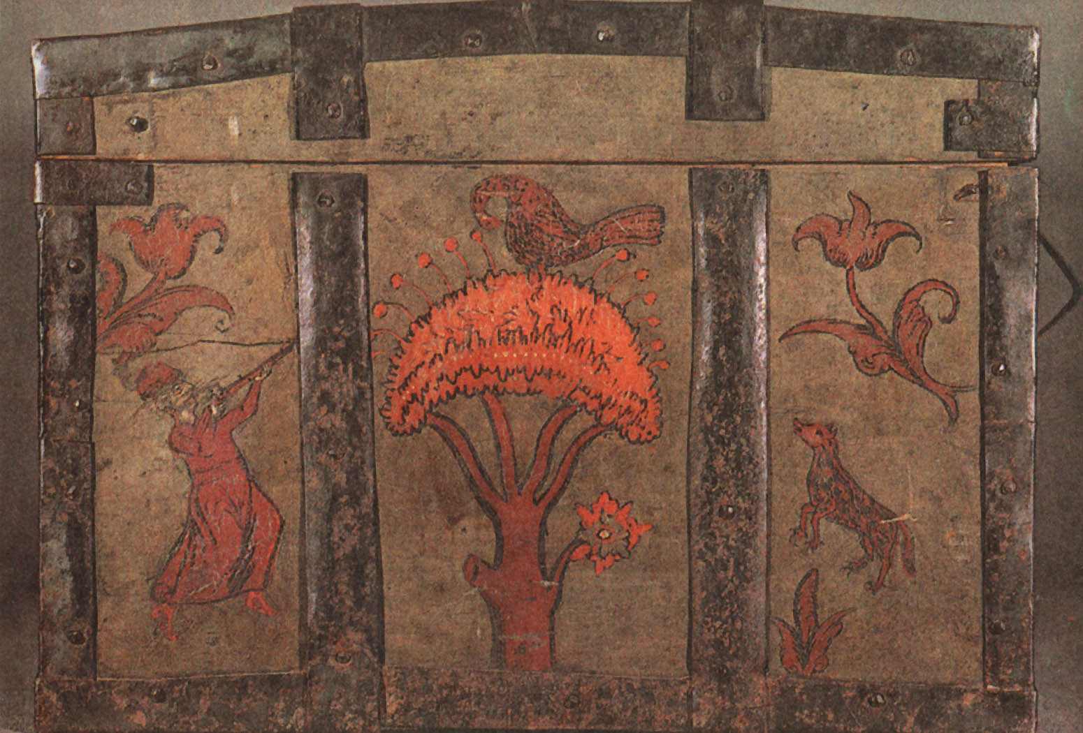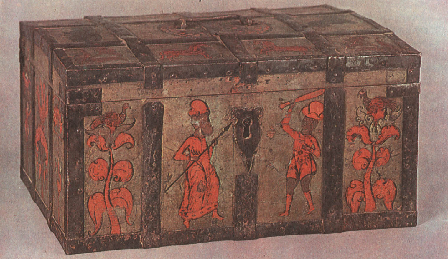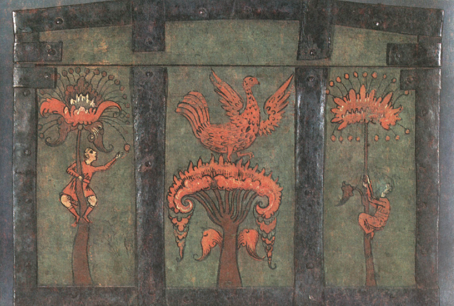 На землях Марфы БорецкойНовгородская живопись навсегда останется одной из самых блестящих страниц не только древнерусского, но и всего русского искусства. «Подъголовокъ Никиты Савиновича Потапова» Перед нами опять сундучок-подголовок— «призголовашекъ травчатой». Наружные стенки его, как тонким кружевом, окованы сплошь просечным железом; переплетенный сложными петлями узор отдаленно напоминает растения. Внутренняя сторона крышки тоже расписана. В центре художник поместил фантастическое дерево. О его ствол опираются поднявшиеся на задние лапы и соединившиеся, как в дружеском объятии, лев и единорог. По обе стороны дерева — старик и юноша, оба в длинных русских рубахах, округлых, опушенных мехом шапках и мягких сафьяновых сапожках. Оба вооружены пиками, только у юноши еще сабля и на конце пики флажок-прапор. Симметрично расставив фигуры зверей, юноши и старца, художник сделал композицию картины уравновешенной и спокойной. Сочетание сине-зеленого Цвета (празелени) с темно-красным (баканом) на желтоватом фоне увеличивает впечатление гармонии и покоя. Задумчиво и важно лицо старца, неторопливо движение его руки, поднявшей пику; словно задумавшись, оперся на оружие юноша; даже бросившиеся друг к другу звери как бы застыли в броске. И лишь птицы на вершине дерева несколько нарушают покой: у них приподняты крылья, полуоткрыт хищно загнутый клюв.