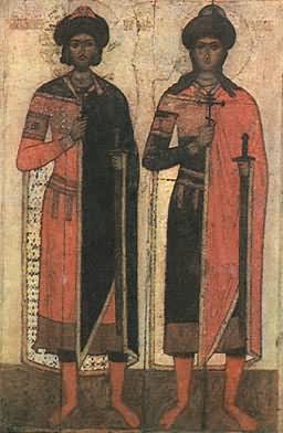 Дело в том, что в те времена, о которых идет речь, цифры обозначались буквами и, чтобы показать, что данные буквы следует читать, как цифры, над ними сверху ставилась волнистая черточка: ее мы и видим над первыми и последними буквами. Попробуем прочитать дату, поставив вместо букв их цифровое значение, учитывая, что для десятков, сотен и тысяч они были разные. Буква А теперь займемся росписью сундучка. Тут нас тоже ждут интересные открытия. Нетрудно заметить, что художественный язык росписи здесь иной, чем у устюжан: силуэт рисунка более строг и спокоен, вместо стремления к яркости и декоративности — сдержанность в цвете. По-иному ведут себя и герои изображений. У устюжских художников они все время в движении, в действии: бегут или прыгают звери, едут на коне или стреляют люди. Неспокойны растения, раскачивающиеся и извивающиеся на своих тонких стеблях. Персонажи в росписи подголовка Потапова своим покоем и статичностью напоминают нам героев сказочного заколдованного царства: они как бы остановились в тех движениях и позах, в каких их застиг мгновенный сон. В передаче движений, в плавности линий видна рука опытного рисовальщика, знакомого с иконописным искусством. Стиль исполнения росписи напоминает нам произведения новгородских художников XII—XVI веков. Расположенный на северо-востоке страны, на реке Волхове, этот город до подчинения Москве был вольным, имел свое управление, по своему усмотрению организовывал хозяйство и жизнь. Его широкие связи с городами внутри страны и с Западом привели к расцвету культуры: как показывают найденные грамоты на бересте, уже в XII веке письменность в Новгороде была распространена широко, как нигде в мире. Высокого уровня развития достигло и искусство; город славился изделиями ремесленников разных специальностей, в том числе ювелиров, резчиков по дереву. Однако первое место среди них принадлежало живописцам: созданные ими произведения вошли в сокровищницу мирового искусства. Так, например, всему миру известна новгородская икона Бориса и Глеба XV века. Эти князья, объявленные после гибели святыми, почитались в Новгороде больше других. Симпатии к ним объяснялись, видимо, их трагической историей. Борис и Глеб были младшими братьями киевского князя Ярослава Мудрого. В начале XI века, после смерти князя Владимира, между Ярославом и Святополком завязалась борьба за киевский престол. Так как Ярослав был новгородским князем, население этого города участвовало в борьбе на его стороне. В междоусобной распре Борис и Глеб были предательски убиты. Коварство и жестокость совершенного злодеяния сделали обоих братьев героями-мучениками. Их стали считать святыми, изображали на иконах. Новгородские художники писали их особенно часто. ![]() Князья Борис и Глеб, предательски убитые Святополком. Новгородская живопись. XV век. Одетые в дорогие княжеские одежды, Борис и Глеб стоят рядом: старший (с бородкой и усами) — слева, младший — справа. Внешним обликом фигур художник удивительно тонко сумел передать мужество и благородство обоих братьев: задумчиво-спокоен устремленный на зрителя взгляд, торжественна осанка, сурово-величавы лица, спокойно-замедленны движения рук с мечом и крестом. Спокойствие и сдержанность произведения подчеркиваются и его красочной гаммой: светлые блики на коричневом в лицах, сочетание темн