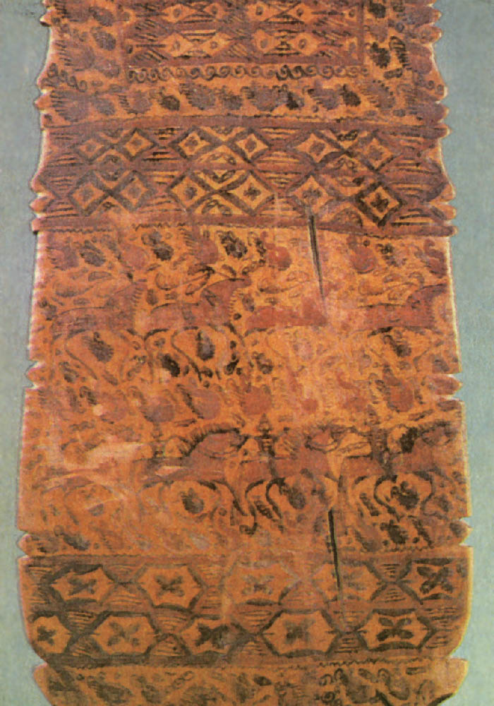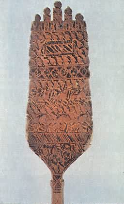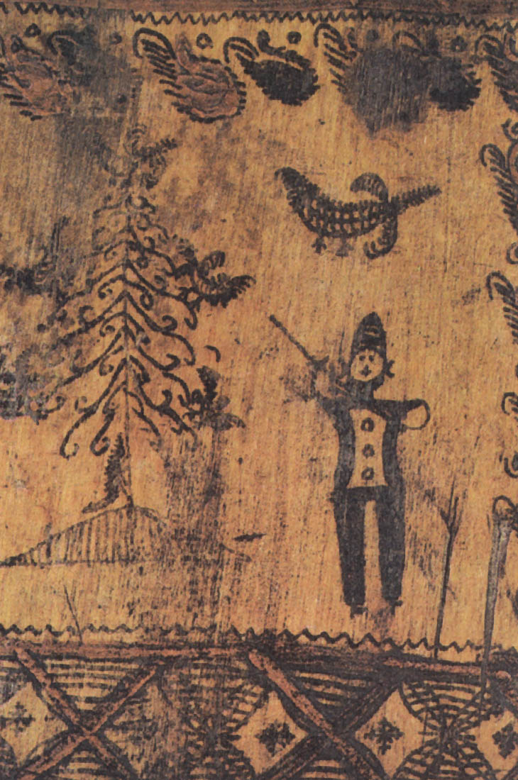 Росписи МезениЛюбопытную и таинственную разновидность крестьянской расписной декорации... представляет мезенская школа росписи... Орнамент, сохраняющий в своих элементах глубочайшие пережитки архаики греческих стилей, густым кружевом покрывает поверхности деревянных предметов. Кони, лебеди и олени На далеком севере, среди болот и непроходимых лесов течет широкая и полноводная Мезень. На высоком берегу ее, в среднем течении реки, расположено большое село Палащелье. Именно здесь во второй половине прошлого века возникло еще одно направление живописного мастерства, которое называют мезенской росписью. Сурова и трудна жизнь обитателей села. Приливы океана гонят в реку мощные потоки воды, она часто выходит из берегов, грозя затопить деревни. Крепкими заплотами из бревен защищаются жители от коварной реки. Вокруг села дикие леса. От голодных хищников тоже нужно охранять и себя и домашний скот. Вместе с тем река и лес кормят человека: в лесу много ценных пушных зверей, дикой птицы. В реке крупная и мелкая рыба не переводится круглый год. Потому-то все жители деревни — охотники и рыболовы. Кроме того, хорошие природные условия позволяли разводить коней и оленей. Чтобы познакомиться с мезенскими росписями, снова обратимся к прялкам: их чаще всего расписывали мезенские художники. Это не случайно: именно нарядные прялки пользовались особенно большим спросом у населения; кроме того, ровная и гладкая их поверхность позволяла художнику лучше, чем на других предметах, показать свои способности. Мезенская прялка по размеру меньше, чем борецкая, тоньше и стройнее. Небольшая, срезанная по нижним углам лопаска украшена наверху главками на тонких шейках, которые в деревянном зодчестве называются барабанами. Срезанная на два ската и увенчанная главками верхушка прялки напоминает своим контуром «премудроверхие» церкви Севера. Вся поверхность прялки без предварительной грунтовки окрашена в золотисто-коричневый цвет, а по этому фону черной контурной линией нанесен причудливый, раскрашенный красным орнамент. Эта очень скупая цветовая гамма (краски добываются здесь же, на месте) и составляет отличительную черту мезенской росписи. При первом взгляде трудно понять, что же хотел изобразить художник. Множество как бы небрежных черточек, точек, завитков и волнистых линий сплошь заполняют лопаску прялки. Только приглядевшись внимательно к рисунку, мы начинаем замечать правильные ряды орнамента, каждый из рядов заполнен своими изображениями, которые интересно рассмотреть. ![]() Прялка с мезенской росписью. Архангельская область. Село Палащелье на Мезени. Последняя четверть XIX века. Прежде всего, различаются фигурки каких-то животных. У них прямоугольные туловища и паучьи, волнисто изогнутые ноги. Ошибиться нельзя — это кони, быстро бегущие вперед. Окружающие их мелкие спиральки, черточки, звездочки и кружочки усиливают впечатление движения. Кажется, что бег коней взвихрил все вокруг, поднял в воздух, закружил и все летит вместе с ними. В другом ряду так же своеобразно и точно художник передал бег оленей; скупыми штрихами подчеркнуты их характерные черты: длинная шерсть, ветвистые рога. Олени тоже бегут, высоко подняв голову, так что рога лежат на спине. Еще выше мы видим рыб в струйках воды и лебедей с сильной грудью и красиво изогнутой шеей. Каж